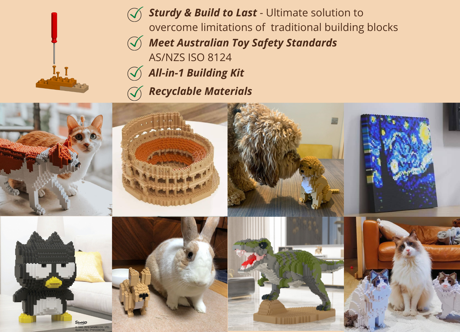 JEKCA is very different from traditional building bricks - our patented technique ties the bricks together, and allows you to build a sturdy sculpture. Building JEKCA bricks is more challenging and requires more skills, but at the same time with a higher level of satisfaction that traditional building blocks can never offer.